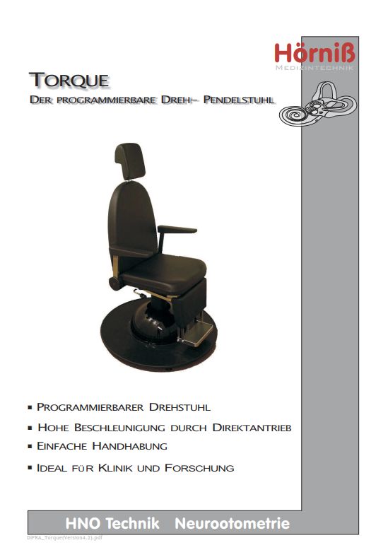 Direkt angetriebener, programmierbarer Dreh- und Pendelstuhl für den klinischen Einsatz. Das Gerät zeichnet sich aus durch seinen leistungsstarken Motor, der Beschleunigungen von bis zu 1080°/Sek.² erreichen kann. Alle Dreh- und Pendelbewegungen sind frei programmierbar. Dank des Direktantriebes erhalten Sie für alle Patienten bis zu einem Gewicht von 150 kg exakte Beschleunigungswerte. Durch den variablen Patientenstuhl (Greiner Oberteil) kann eine kalorische Prüfung in gewünschter Patientenlage durchgeführt werden. Die Steuerung erfolgt über die gleiche Software (DISOFT II) wie die Analyse Software. Die Bewegung des Stuhls wird mit aufgezeichnet. Im Lieferumfang ist ein Steuertisch enthalten, der den Systemrechner und das Steuernetzteil des Drehstuhls integriert.