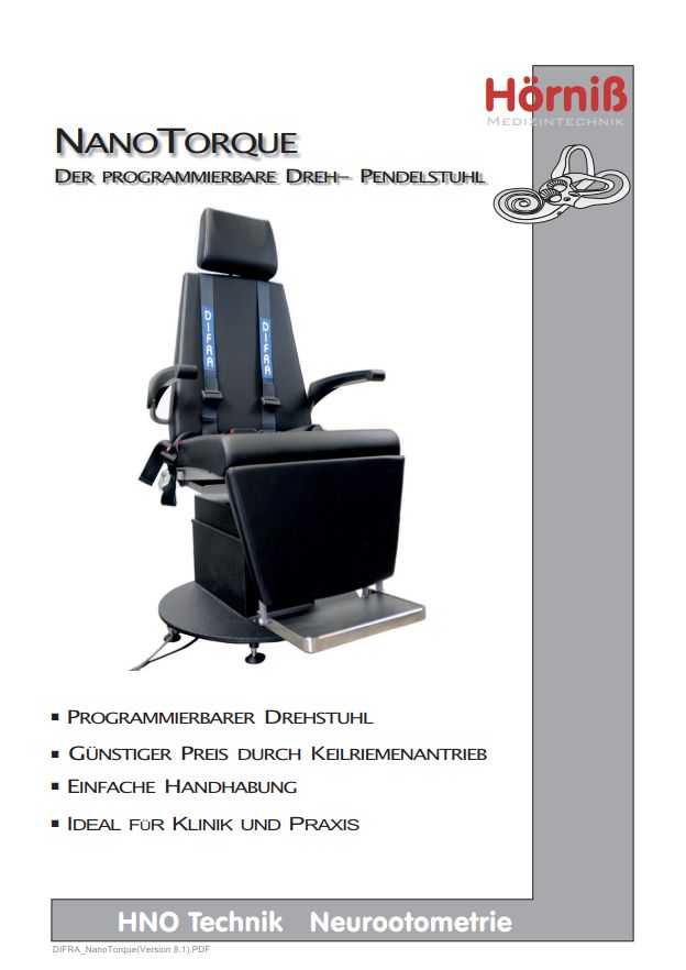 Programmierbarer Dreh- und Pendelstuhl mit Keilriemenantrieb für den klinischen und Praxis Einsatz. Alle Dreh- und Pendelbewegungen sind frei programmierbar. Durch den variablen Patientenstuhl (Greiner Oberteil) kann eine kalorische Prüfung in gewünschter Patientenlage durchgeführt werden. Die Steuerung erfolgt über die gleiche Software (DISOFT II) wie die Analyse Software. Die Bewegung des Stuhls wird mit aufgezeichnet.