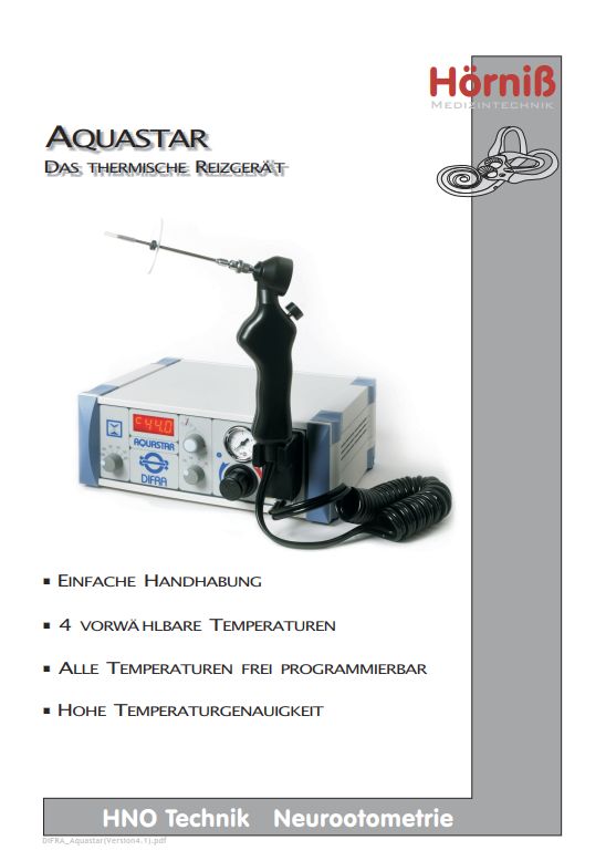 Der Wasserkaloristat AQUASTAR dient zur kalorischen Prüfung des Vestibularis-Organes mittels Wasser. Modernste Mikroprozessortechnologie ermöglicht eine einfache Bedienung, gewährleistet eine hohe Temperaturgenauigkeit und exakte Dosierung der Spülmenge.