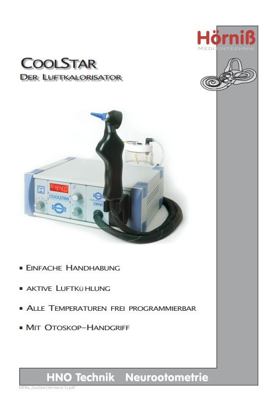 Der Luftkaloristat COOLSTAR dient der kalorischen Prüfung des Vestibularis-Organes mittels Luft. Das Gerät verfügt zusätzlich über eine aktive Kühlung. Modernste Mikroprozessortechnologie ermöglicht eine einfache Bedienung, gewährleistet eine hohe Temperaturgenauigkeit und exakte Dosierung des Luftstromes.